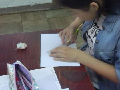 今回は,分度器やコンパスを使って,拡大図や縮図をかく方法を考える学習をしています。拡大図や縮図をかくために必要なところの長さや角度をはかってかいていました。