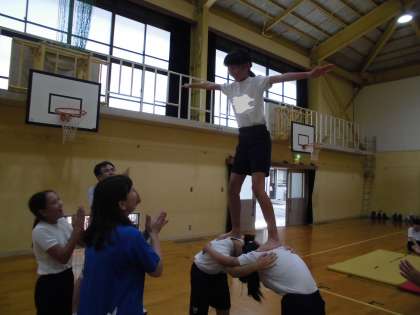 今回は,3人技や6人技などを練習しました。パートナーと息を合わせないとうまくいきません。そのタイミングや気持ちを合わせるために声を掛け合いながら,がんばって練習していました。