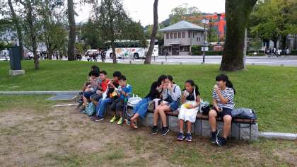 「京都市小学生演劇鑑賞教室・魔法をすてたマジョリン」を鑑賞しました。劇団四季のみなさんによる,歌ありダンスありの大興奮のミュージカルでした。また個性的な登場人物の演技に大きな歓声や笑い声がたびたび上がるほど面白いものでした。きっと心に残るものがあったと思います。とても素敵な時間を過ごすことができました。写真は,鑑賞後,広場でお弁当をおいしそうに食べているところです。お弁当の準備ありがとうございました。
