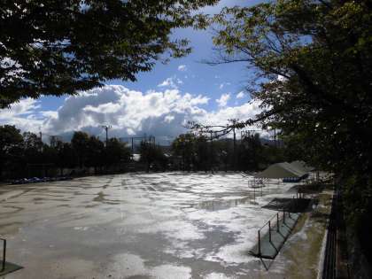 子どもたちが心待ちにしていた運動会でしたが,予想以上の雨で運動場が海のようになり,延期を余儀なくされました。朝早くから運動場にお集まりいただいた保護者の皆様,地域の皆様には傘をさして状況を見守っていただきましたが,9時30分に延期を決定しました。