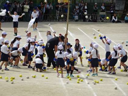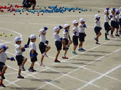 1年生の玉入れです。ダンスとダンスの間に競技があり,リズミカルです。だんだんと速くなる踊りに一生懸命です。