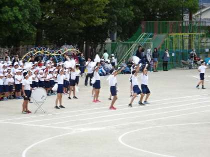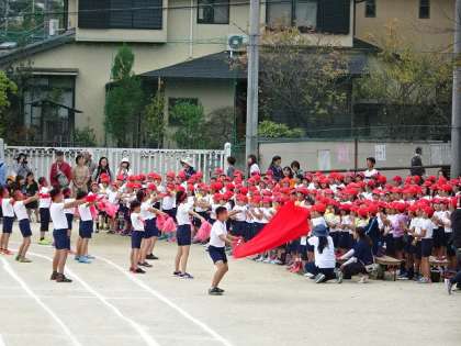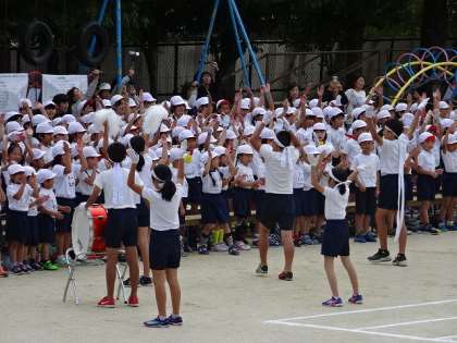 応援合戦です。赤も白も大きな声で力いっぱいコールをしています。