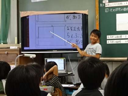 算数「面積」の学習を行いました。どんな複合図形の面積の求め方ができるか,2人組や全体で話し合い,解いていきました。