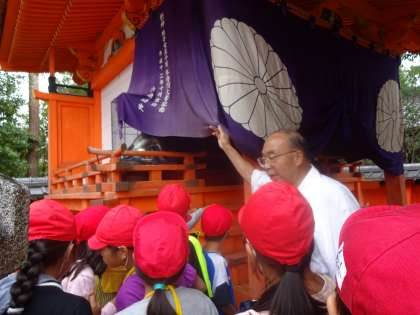 3年生は,総合的な学習の時間に,福王子祭について調べています。今日は,福王子神社を見学させてもらいました。祀られている班子女王のことや,元の建物は応仁の乱で焼けてしまったこと,後に復元して建てられたことなど,貴重なお話をたくさん聞かせていただきました。また,京都府の石にも指定されている「鳴滝砥石」など,神社の宝物も見せていただきました。通学路としても身近な福王子神社ですが,初めて知ることばかりで,子どもたちは驚いた様子でした。
