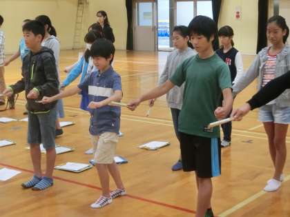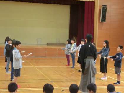 後半の学習の様子です。子どもたちの感想には,「踵を上げずにすり足で歩くのが難しかった。」とか「独特の調子で動くのが動くにくかった。」など,能楽特有の所作に関するものが多かったです。また,「能楽師の先生の声がすごかった。」とか「本物の能を見に行きたい。」など,能楽に対する興味も持てたようです。