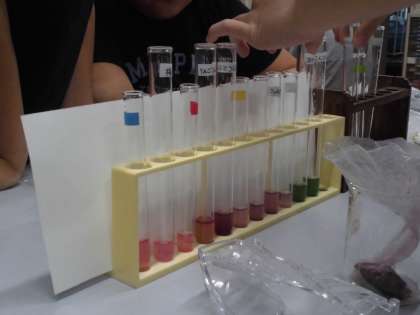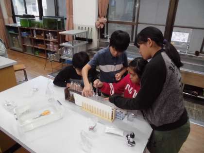 理科の学習で「水よう液の性質」について学習をしています。今回は紫キャベツの絞り汁を使って,いろいろな水よう液の液性を調べました。紫キャベツ液は濃い紫色をしていますが,水よう液の液性によって,色が変わります。一瞬で鮮やかに変色する様子を見て,子どもたちはとても驚いていました。そして,変色した水よう液を酸性からアルカリ性まで順に,班で相談しながら並び替えました。この実験はおうちでもできますので,またおうちでもやってみてほしいと思います。いつも飲んでいるものや使っているものは何性を示すでしょうか。