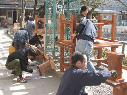 組み立てられたベンチとテーブルに塗料を塗っています。