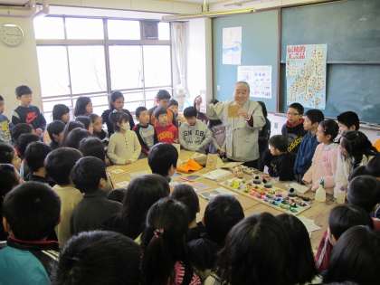 3月8日(火)に型友禅体験をしました。型友禅とは京都の伝統工芸のひとつで,特殊な型紙に絵図を彫刻し刷毛刷りして模様をあらわしたものです。今回の体験では,ふくろうの絵の型紙を使って,豆色紙に絵を刷りました。宇多野地域にお住まいの伝統工芸士の岡本様に教えていただきました。同じ型紙を使って,同じ道具を使っていても,微妙な色合いの違いなどで,まったく同じ作品はできません。子どもたちも真剣に活動して,それぞれにすばらしい作品を作ることができました。子どもたちが持ち帰った作品をぜひ,飾っていただきたいと思います。見れば見るほど,だんだんと,いい味がでてくると思います。これを機会にして他の伝統工芸品についても興味をもってほしいと思います。