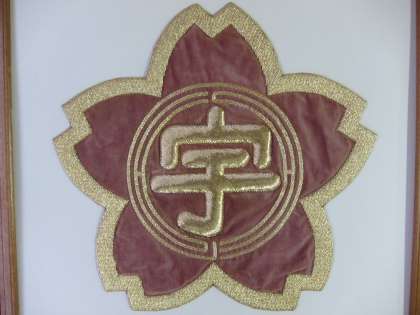 校区が有名な桜の名勝地であることにちなんで、外形をサクラ形にし、その中に校名の頭文字「宇」を囲んで「多」と「の」を三重円に構成してまとめたものです。校歌とともに昭和49年に制定されました。