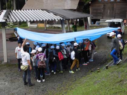カレーを食べ終わったころから夕立のような雨が降り出しました。片付けが終わり,山の家の宿泊棟の本館に戻る際,「人間ブルーシート傘」が出現しました。「おやじの会」の4名でブルーシートの四隅を持って,その下に20人以上の子どもたちが入って歩きました。思いがけない大きな傘に心があたたまりました。