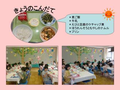 今日は、2年1組です。みんな、ランチルームで食べる給食が大好きです。