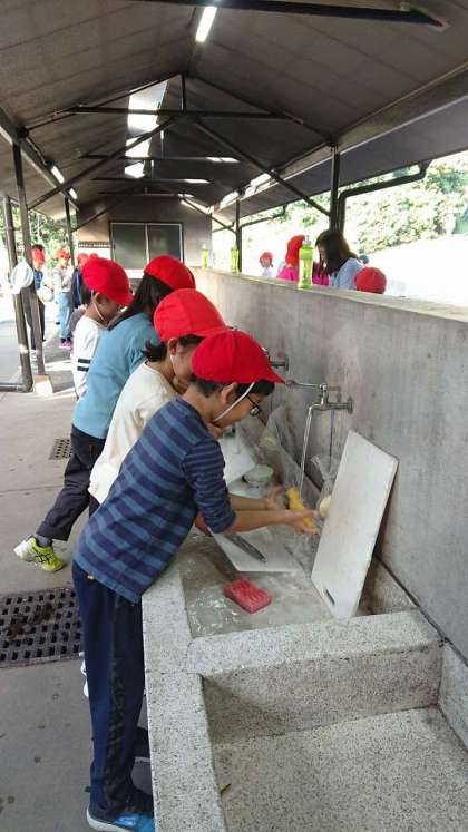 野外炊事の様子です。みんなはりきっています。