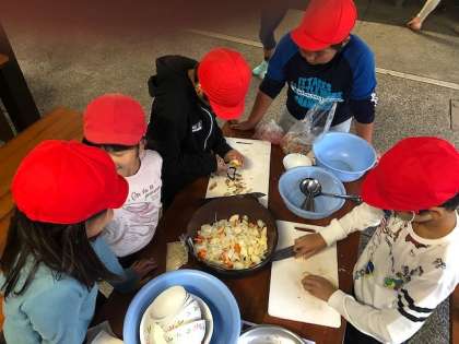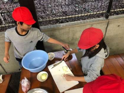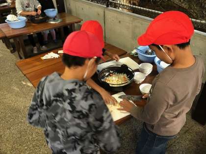 野外炊事の様子です。はりきりすぎて興奮しているようです。けがしないようにねー!