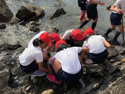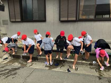 海の生き物は見つかったかな?観察の後は,きれいに足を洗います。