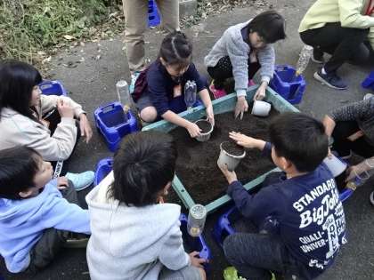 球根のまわりに色のテープが貼っており,おそらくそれが花の色かと思われます。しかし,子どもたちは「本当に赤い色のチューリップが咲くのかな?」と半信半疑です。これからしっかりと花が咲くまでお世話をして,花の色を確かめてほしいと思います。