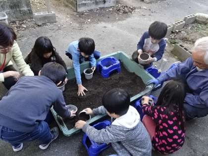 いつも土を耕すときや花を植えるときは,地域の園芸ボランティアさんが手伝いに来てくださっています。とても助かっています。