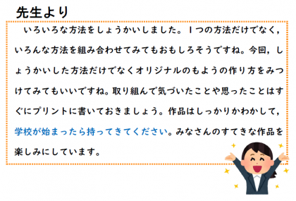 家に画用紙がある人は,学校から配った画用紙以外にも取り組んでみてもいいですね。