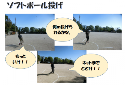 みなさん体を動かしていますか。先生たちは,ボールの点検もかねてソフトボール投げをしましたよ。みなさんもできることを考えて,体を動かしましょう!