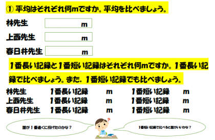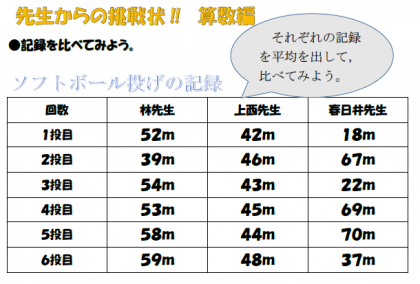 それぞれの投げた距離を記録しました。いろいろ比べてみましょう。よく考えてね。
