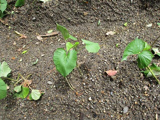 下の方はしおれているけれど,あたらしいはっぱが出てきています。みんながもうすぐ学校にくるのがわかって,サツマイモも元気になったんだね。でも,しんぱいなことが・・・「てんとうむしもどき」というニセモノのてんとうむしが,はっぱをたべているのです。さあて,こまったなぁ。