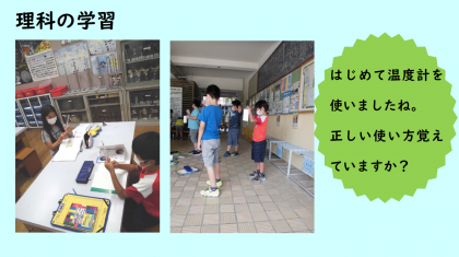 理科の学習では初めて自分たちで温度計を使いました。正しくはかる方法をもう一度確認しましょう。めもりの見方はどうだったかな。どんな場所ではかるのかな?
