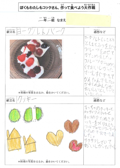 ひんやり冷たくて,これからの季節にぴったりです。季節の果物をのせると違った味が楽しめますね。3つの味のクッキーは見ても食べても楽しいですね。「おいしい。」といってもらえてうれしかったね。