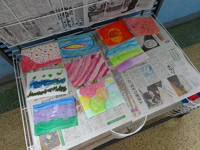 今回は絵の具を使って,心の感じるままに筆を走らせ,模様を描きました。中にはスポンジや歯ブラシ,ストローを使って工夫をしている姿も。