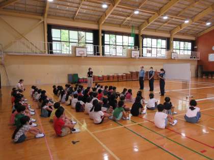 右京警察交通課の3名の方々にお越しいただき,1年生に向けての交通安全教室を開いていただきました。