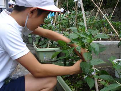 21日(火)にピーマンの収穫をしました。大きくなったおいしそうなピーマンを収穫して子どもたちもとても嬉しそうでした。一つですが、お家でおいしく食べてください。