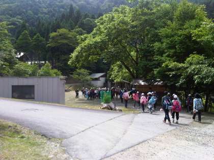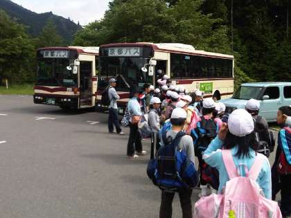 山の家からバスに乗り、交流の森へ出発。今日のテーマは「心をひとつに」です。