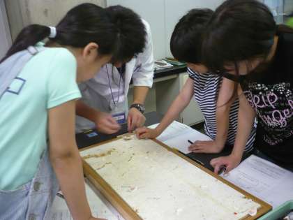 月曜日に科学センター学習に行きました。3組は地学の学習でした。センターの先生のお話では,地球ができた頃は95%は二酸化炭素で覆われていたそうです。ではなぜ今,地球の大気の二酸化炭素は46億年前と比べて減ったのだろう?というめあてで学習をスタートさせました。二酸化炭素が減ったのは,石灰岩(SKG)のおかげということを知ったあと,石灰岩に二酸化炭素が閉じ込められているかを実験で確かめました。子どもたちからは「すごい。二酸化炭素がいっぱい入ってた。」「普通の石にはないのに。」など驚きの声が聞えてきました。謎が解けたところで石灰岩を磨いて石の標本づくりをすることになりました。一生懸命磨けば磨くほどピカピカでつるつるの石ができると聞き,みんな必死で磨いていました。最後に水で洗い流すとびっくりするくらいきれいになっていました。地球の秘密を知り,標本もつくることができ大満足のセンター学習でした。