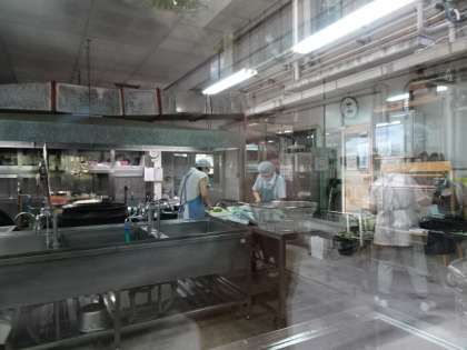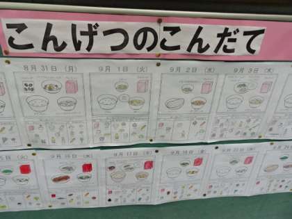 4人の調理員さんが給食をつくっています。調理室の前に献立表に色を塗ったものを貼っていますが,子どもたちが見に来ては,献立の話題をしています。