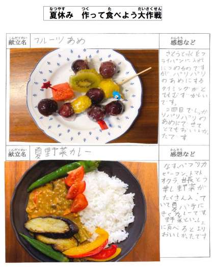 夏休みに家庭で料理にチャレンジしてくれた人の作品を紹介します。彩りよくおいしそうに出来ましたね!