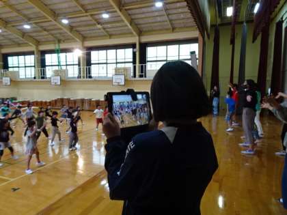 今年は1年生を迎える会が出来なかったので,児童会計画委員さんが企画を練りました。1年生に動画のプレゼントをすることになり,学年ごとに順番に撮影をしています。「宇多野2020」のドラえもん体操をしているところを撮影し,1年生に向けたメッセージテロップを入れて動画をつくる予定です。
