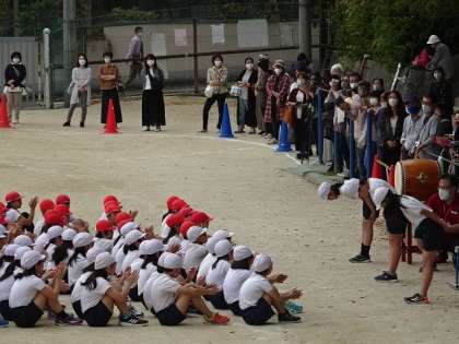 高学年の部も児童の挨拶から始まりました。緊張感に包まれたオープニングとなりました。でも,ドラえもん体操はみんなニコニコでした。