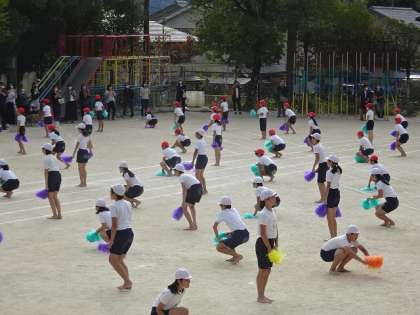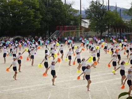 WANIMAの「ともに」の曲に合わせてポンポンをもって踊りました。何度も何度も合わせたこの演技,運動場は一体感に包まれました。
