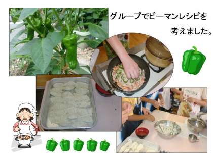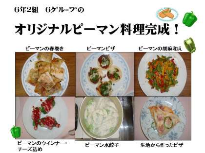 6年生は,高知県からいただいたピーマンの苗を育て,たくさんのピーマンを収穫することができました。グループごとに,ピーマンのレシピを考え,みんなで協力して調理しました。「ピーマンで,こんな料理ができるんだ!」子どもたちの創作力に感心しながらどんな料理ができるのか,どんな味になるのか,とっても楽しみでした。