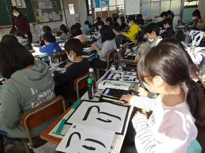 習字で「つり」という文字を書きました。よくお手本を見て書いていました。空いているスペースに「はらい」の練習をしている子もいました。これからいよいよ本番,清書します。