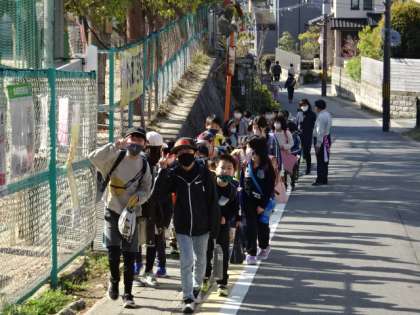 町別に1年生を仲間に迎え,まだ慣れない1年生のペースに合わせてゆっくり歩いたり,後ろを気にして振り返りながら進んだりする新リーダーさん達の頑張る姿が輝いています。