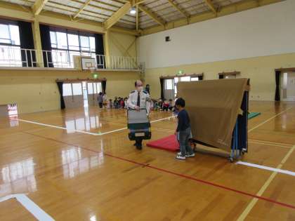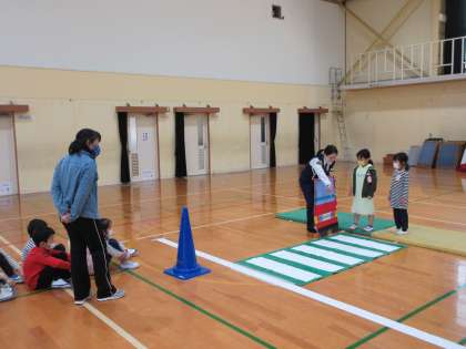 「安全な道の歩き方」を学習した1年生は,交通課の方々が準備していただいた道路を実際に歩き,実行できるかどうかを確かめました。