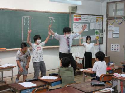 写真は,教頭先生がレクリエーション係の子どもたちに,キャンプファイヤーで行うゲームをレクチャーしている様子です。