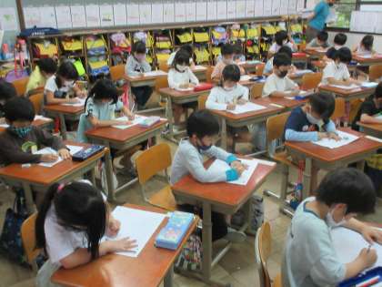 今日の1年生は,『おかあさん』『おじいさん』『ほうせんか』『すいとう』『てつぼう』などの「ながいおと」を表す平仮名の言葉を,なぞって書く練習をしました。