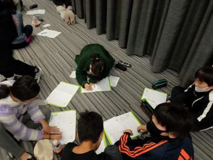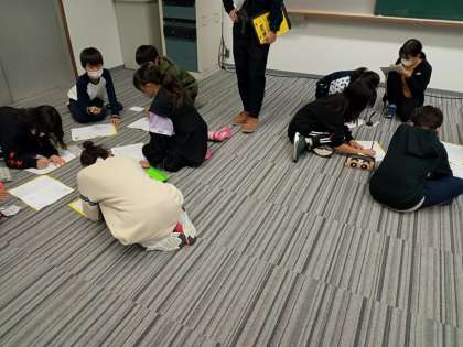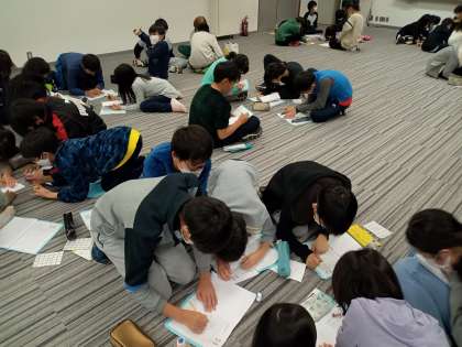 今日一日を班で振り返っています。挨拶や時間を守ることなど,できたことを交流しながら明日のめあてをグループで考えています。