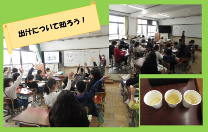 総合「よりよい食生活」の学習で出汁について知りました。こんぶだし,こんぶとかつおの合わせ出汁,吸地の3つを飲み比べました。五感を使って味わっていました。