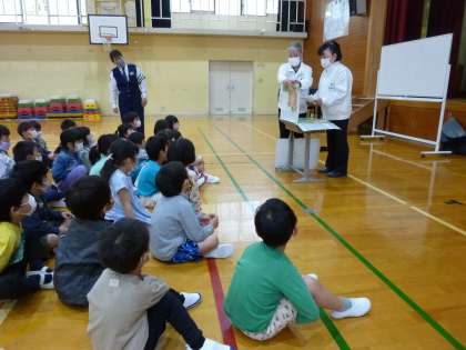 警察の方の話や交通ボランティアの先生の紙芝居を楽しく聞きながら