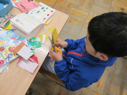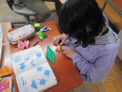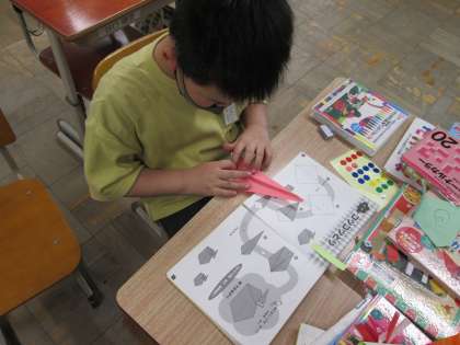 折り紙の本を見ながら教室に飾る折り紙を作りました。