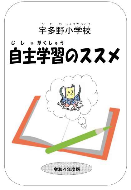 令和4年度版の宇多野小学校「自主学習のススメ」をアップしました。児童のみなさんにもお配りしています。宇多野小学校の先生たちおすすめの自主学習が書いてありますので,ぜひ自主学習をするときの参考にしてください。