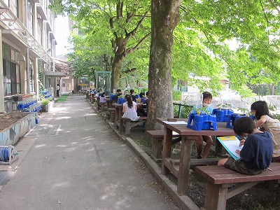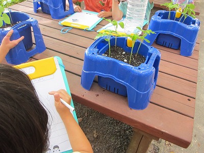 あさがおの成長カードをかきました。「めがでてくれて,ありがとう。」,「ひとりで,おおきくなっていてすごいね。」,「あたらしいはっぱがでてきて,うれしい。」などあさがおが大きくなる様子を喜んでいる子どもたちでした。これからも,水やりをがんばるそうです。