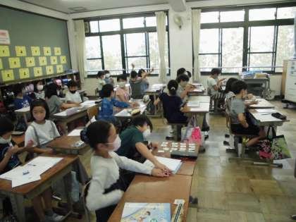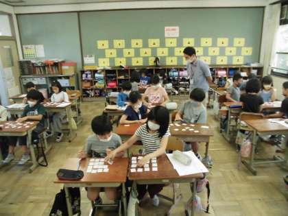 カードを使って遊びや天気,衣服などの英語の言い方を学習しました。カルタや「しんけいすいじゃく」で友達と競い合い,クラス中,大盛り上がりでした。