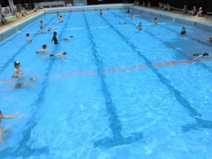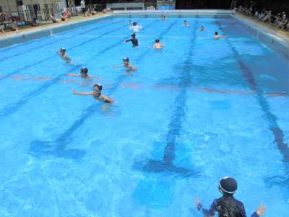 今週から水位が高くなっての「水あそび」です。子どもたちは水を怖がる様子もなく,いろいろな水慣れのポーズを楽しんでいました。